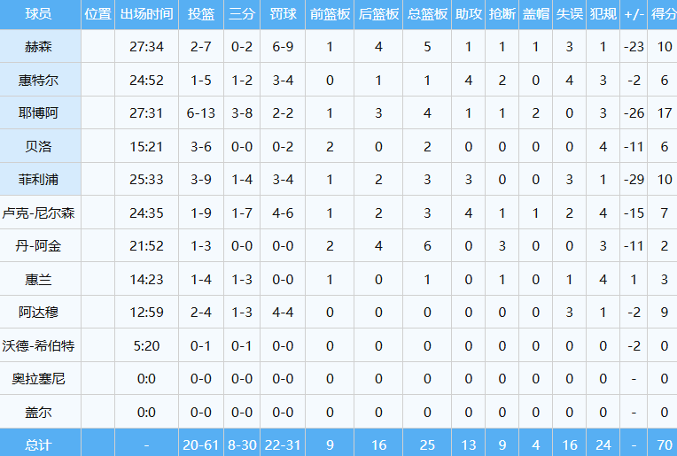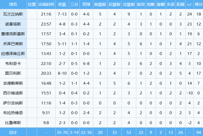 NBA现役球员&立陶宛当家球星瓦兰,首发出战约21分钟,投篮13中7,罚球6中4,贡献18分9板(5前场板)准两双数据,正负值+24全场最高。
